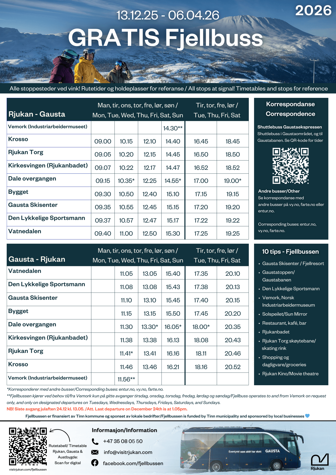 Interesserte finner rutetidene på VisitRjukans nettsider. I tillegg trykkes det opp plakater som henges opp rundt omkring, og informasjon deles aktivt på sosiale medier.