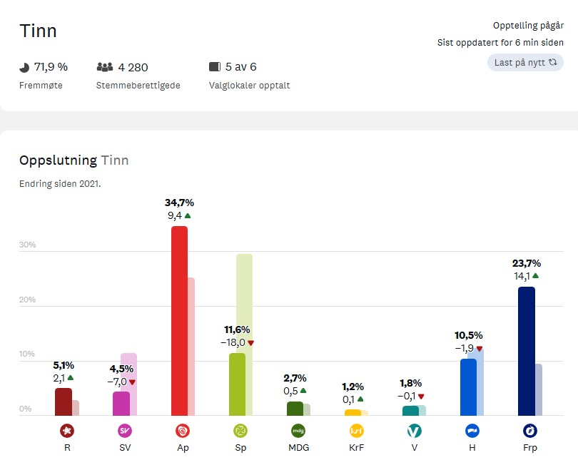 Det foreløpige valgresultatet viser at FrP øker sin opplsutning i Tinn med 14,1 prosentpoeng, mens Ap går fram 9,4. Senterpartiet er valgets store taper både nasjonalt og i Tinn.