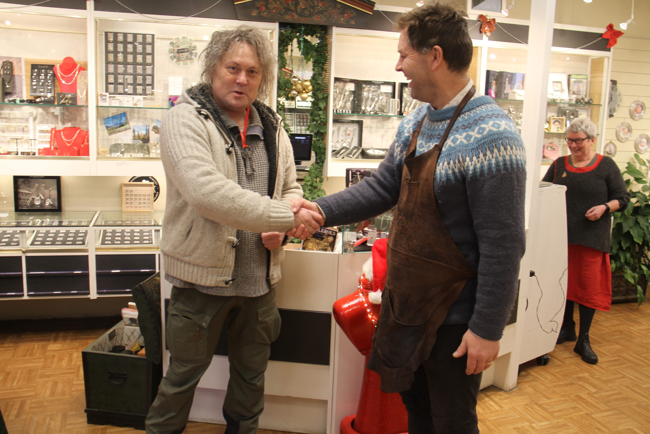 Vi ankommer Gullsmed Sando der vi har fått vite at det skal være fokus på Rjukans hydrant i Verdensarven. For det er nemlig hos gullsmeden at du får hele franchisen rundt Rjukans brannhydranter. Hydrantsmykkene i ulike former, kakeformene og bøkene til Bjørn Iversen. Denne lørdagen før jul sitter Bjørn selv og signerer i butikken, og jammen har han ikke tatt med litt av restlageret med den grønne pærebrusen også.