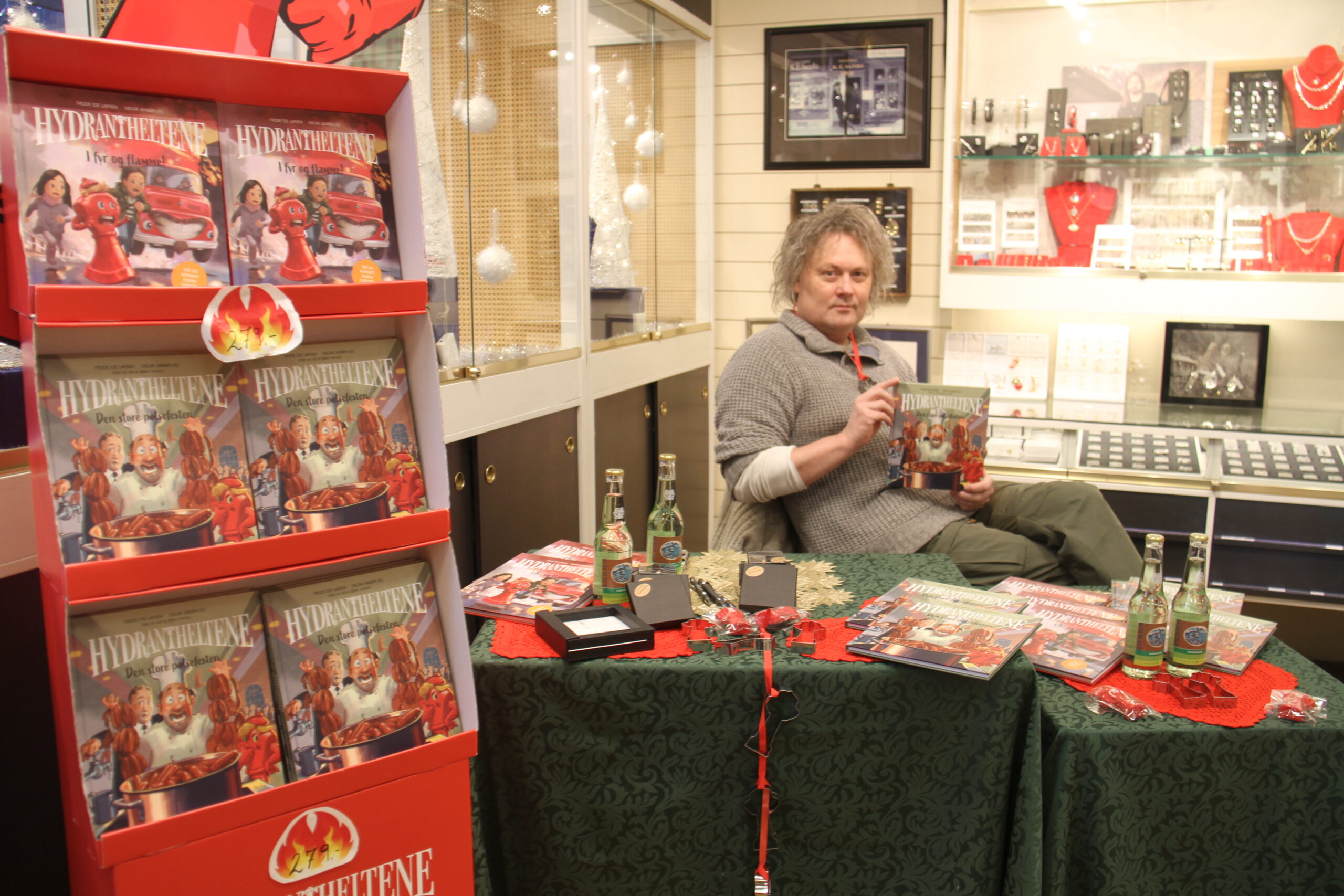 – Det er jo ikke noen hemmelighet at du og Bjørn har hatt godt samarbeid om hydrantsafarier og en rekke hydranteffekter som smykker og diverse. Det er jo naturlig at han inviteres til å signere bøkene sine her i butikken her?