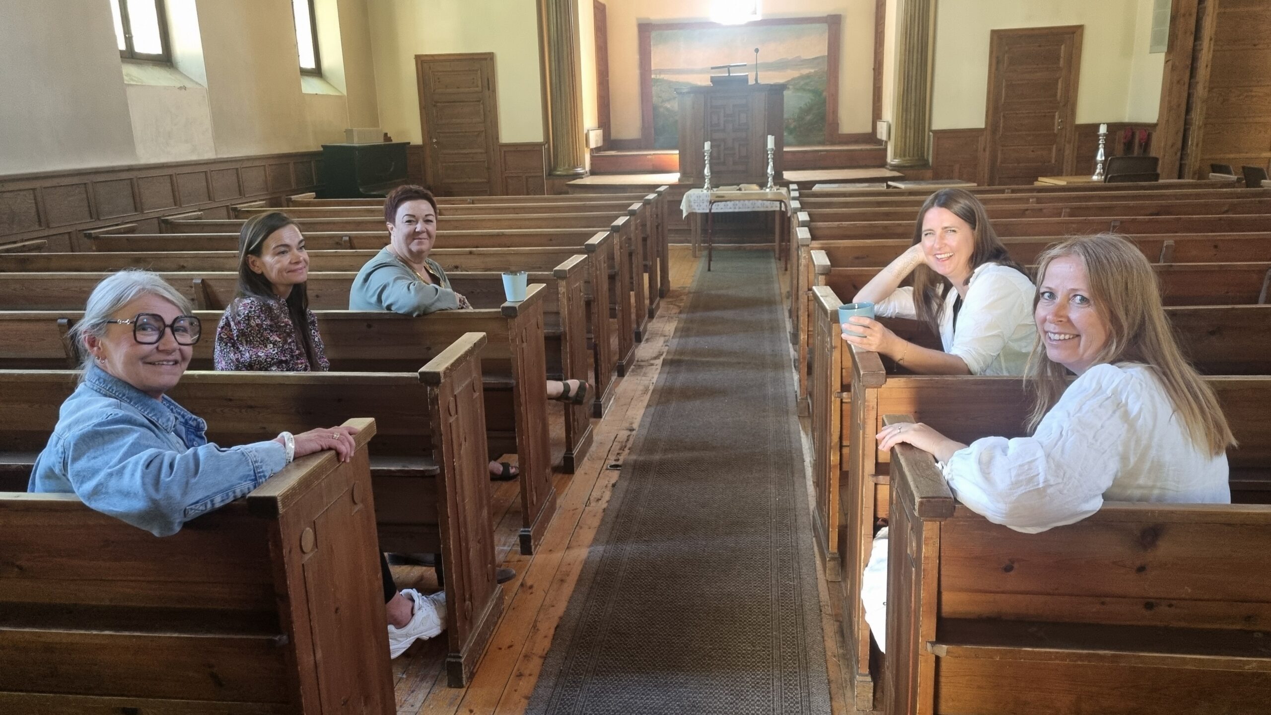 – Jeg elsker den vakre kirken som det egentlig aldri er noe liv i, for jeg har fjellærlighet rett på andre siden av kirken her, og har sittet og sett på dette vakre bygget som står helt uten aktivitet på sommeren. Så da hadde jeg drukket litt mye kaffe en søndagsmorgen da, og kom på at jeg ville ha en utstilling her, sier Nielsen som har invitert et knippe damer til å stille ut.
